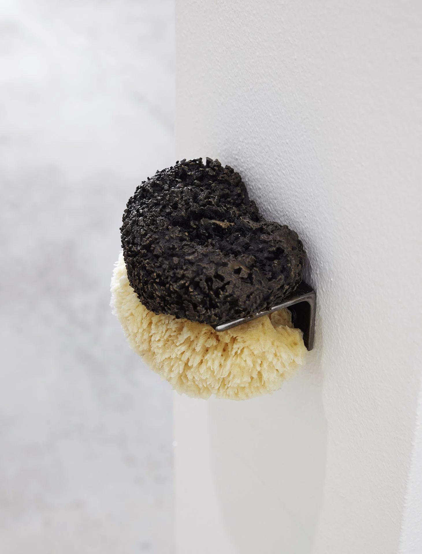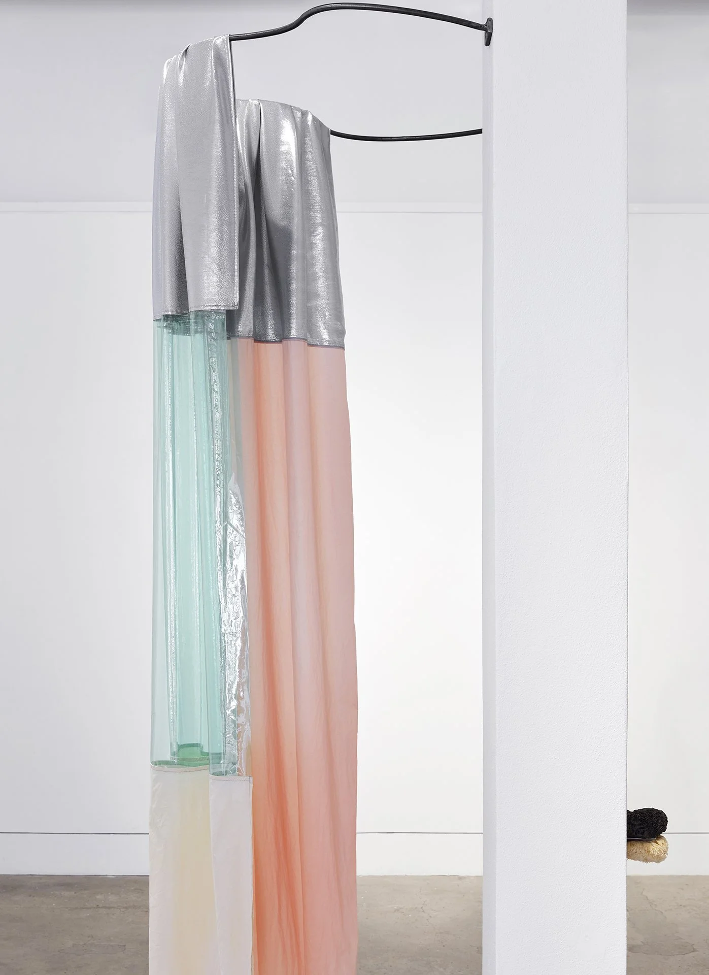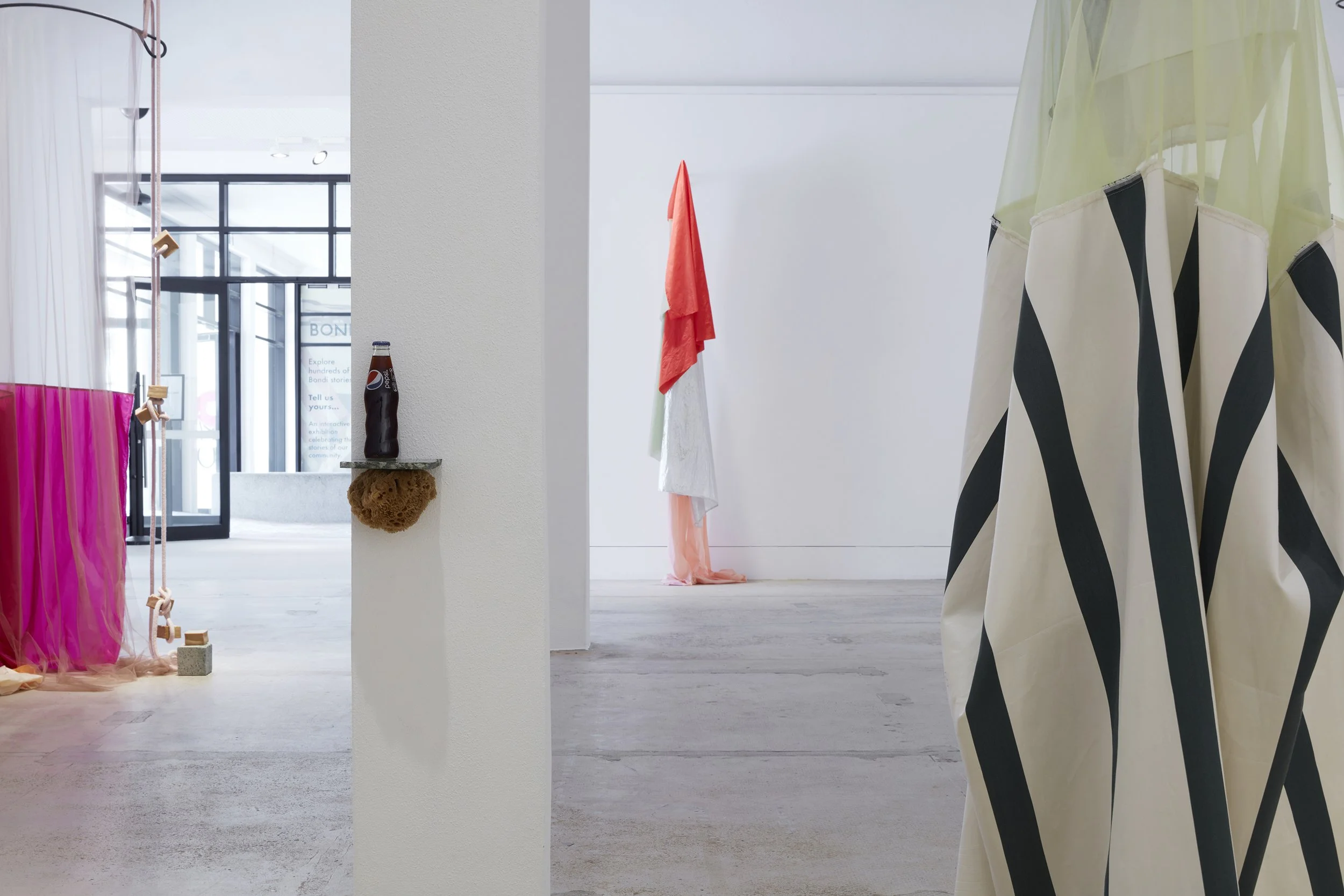 One Sunday, a few weeks later, Brincat and I drive to Bondi to sit in the gallery. It had been a change room before a recent restoration and traces of the old cubicles remain on the floor. Brincat’s practice is sensitive to the qualities or histories of a site. For the installation, a shower curtain hangs from a hand-drawn circular metal rod shaped to the scale of the artist’s body. At hand are two soap dishes. Metal hooks stick out “like a nose and moustache”, as she describes them. These armatures are casually draped with fabric in the same way we “throw a towel over our shoulder at the beach”. The veiled costumes are suspended. Unworn. Brincat jests that she’ll take them “for a walk”, but there will be no scheduled event. While known for her processional performances, here she is interested in the possibilities of a liminal space. In Curtain Call – an installation of props and costumes that could be set in motion at any moment – the gallery is presented as a stage, as though the performance has come and gone.