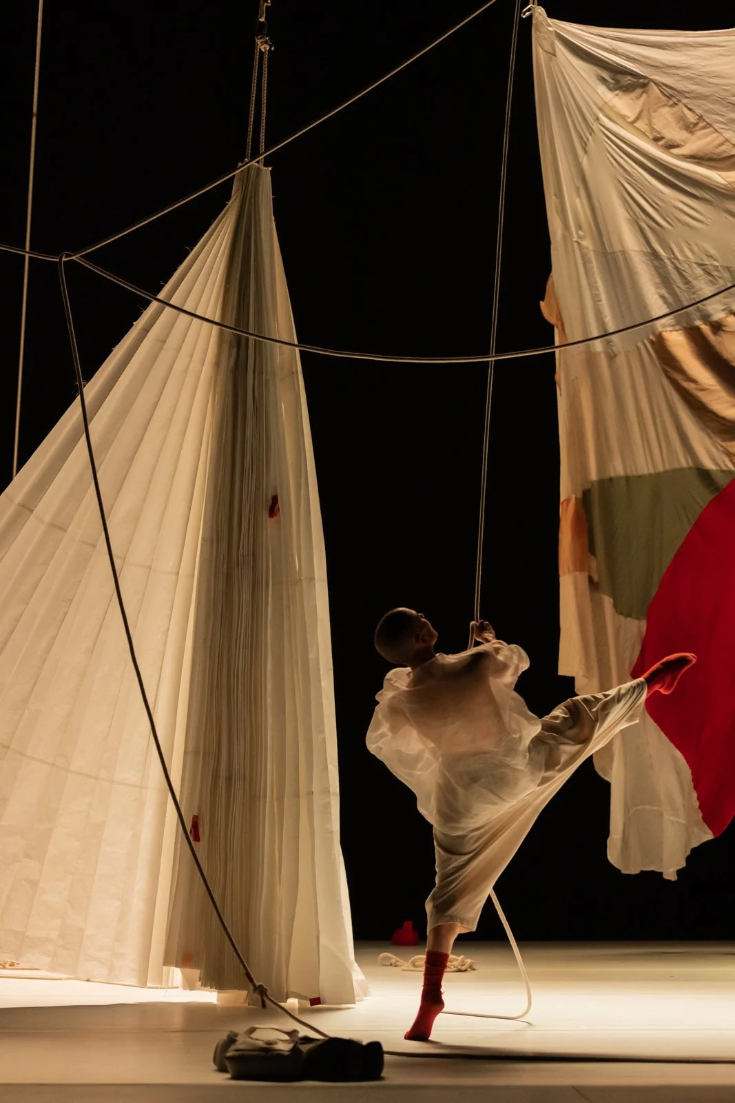 Set & Costume: Hybridise the masculine and feminine, person and animal, biology and technology. The set and costumes work simultaneously to replicate, mimic, produce, and reproduce. Drawing with silk instruments, these mossy landscapes capture atmosphere, becoming extensions of the costumes, lichens, fungus, gills, and spinous structures forming complete sequences. Functioning garments perform as second skins, growths or protective shields. These augmentations encourage us to challenge, subvert and remind us of what’s needed to be human, alive. They compel us to consider alternative views, the moving pleats have continuous contours, changing the topography. The sound this set exudes jolts us from our slumber. Strong colour adds strength, instruction and discordant notes. The rope threads act as mycorrhizal networks - weaving and shifting between chaos and deconstructed nature. They form a breathing ever-changing habitat.