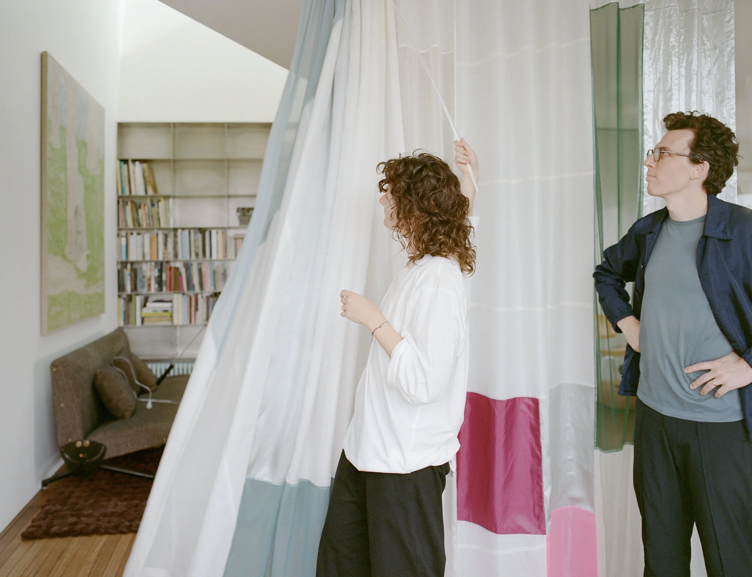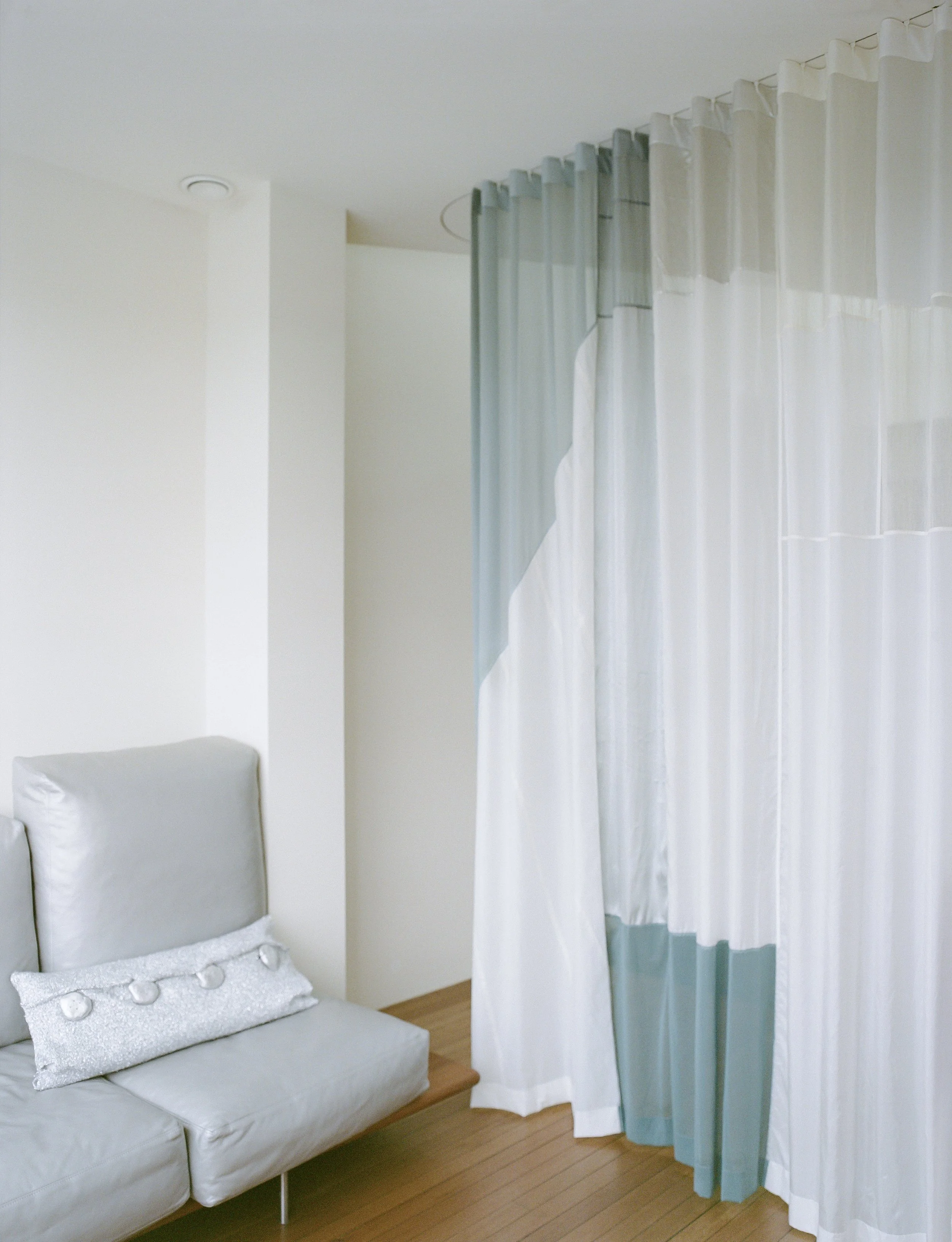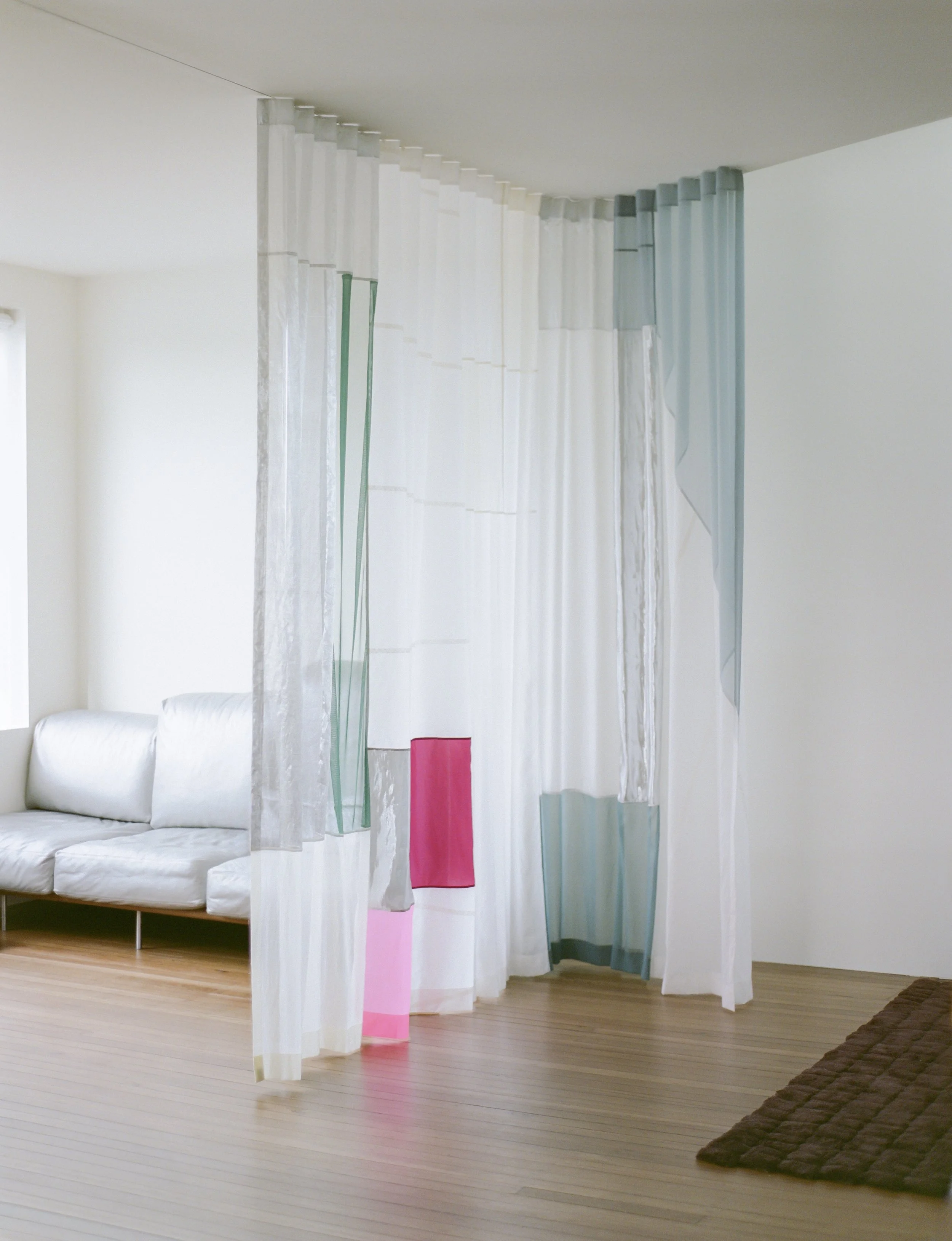 Description: I wish to communicate with you is a spatial textile installation composed of silk, spinnaker cloth, gauze, and fine netting. Positioned between rooms in a private residence overlooking Rushcutters Bay, it defines a soft threshold, filtering light, sound, and movement. Inspired by sailboats, sunlit glittering water, and the quiet rhythm of the loop road, the work responds to its setting through transparency, reflection, and gentle motion. Fabric masks softly clap in time with a site-specific score, introducing rhythm and presence into the space. This is a work of holding and listening: a gesture of hospitality and quiet communication.